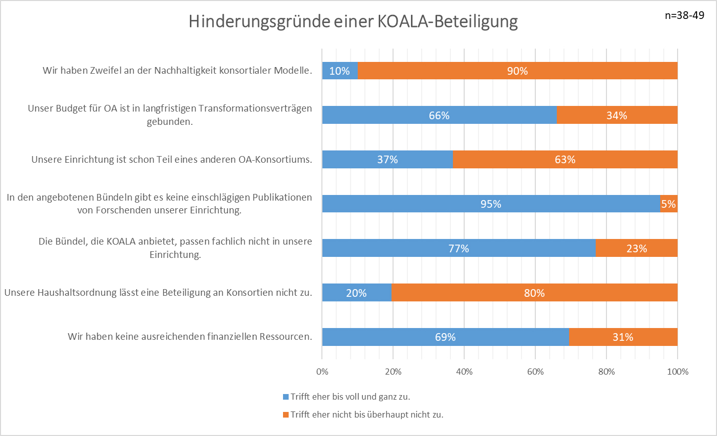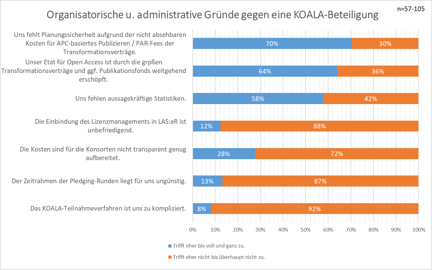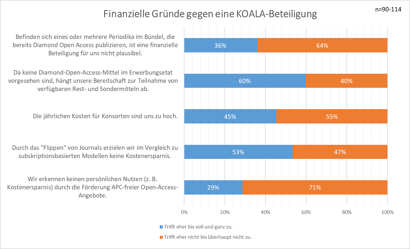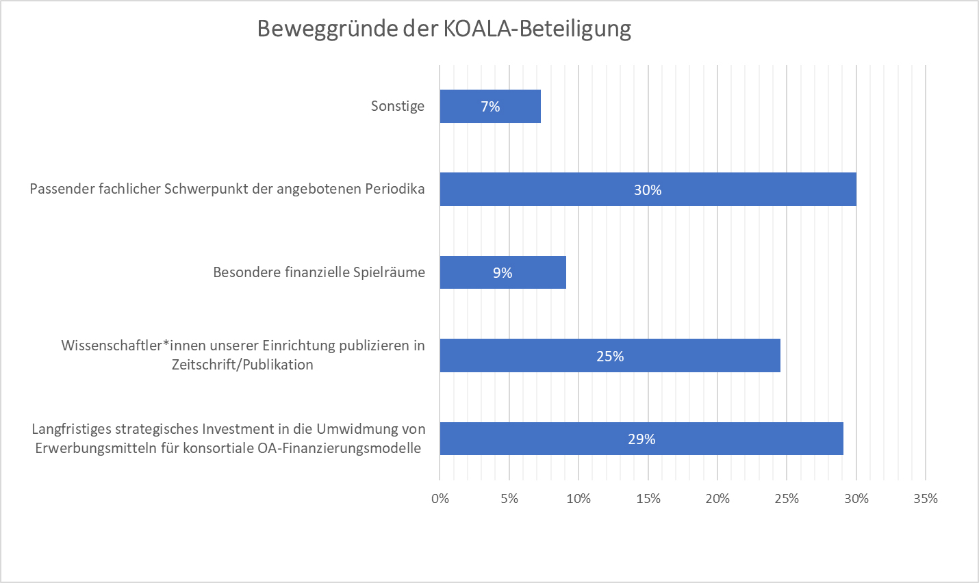 Aufbau und Betrieb des KOALA-Konsortialmodells waren und sind von zahlreichen Gesprächen mit Fachkolleg*innen, verwandten Projekten sowie einer regen Community-Arbeit begleitet.27 Die bereits bekannten Teilnahmehürden wurden im Survey in finanzielle, rechtliche, erwerbungsstrategische und organisatorisch-administrative Gründe gruppiert. Ziel dieser Bedarfsermittlung ist neben der Optimierung des Konsortialangebots die Klärung der Frage, ob grundsätzliche Zweifel an Diamond-Open-Access-Konsortien bestehen, oder ob die jeweiligen gegen eine KOALA-Teilnahme getätigten Entscheidungen sich auf konkrete, veränderliche Rahmenbedingungen beziehen.