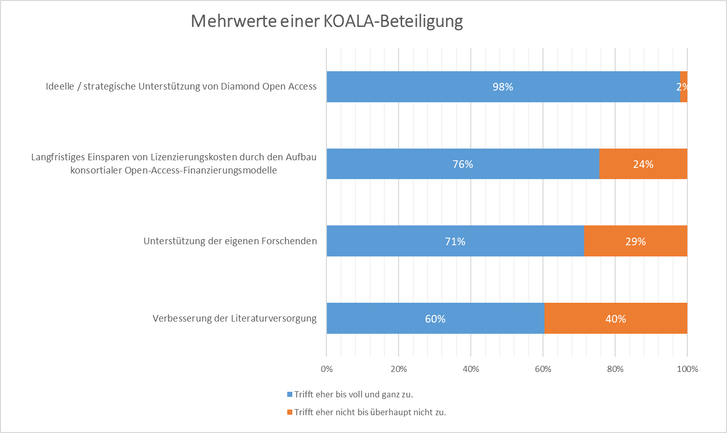 Denn welche erwerbungsstrategische Rolle Finanzierungsmodelle wie KOALA langfristig tatsächlich spielen werden – etwa als Nachfolge von subskriptionsbasierten Erwerbungsmodellen –, hängt nicht zuletzt davon ab, wie effektiv sie den Versorgungsauftrag bedienen, welcher in vielen Einrichtungen noch immer überwiegend durch die Lizenzierung von Medienzugriffen und durch die Finanzierung von Publikationskosten bei stark profitorientierten Publishern erfüllt wird. Die hier vorgestellte Umfrage demonstriert, dass Konsortialangebote im Diamond-Open-Access-Bereich tendenziell an denselben Kosten-Nutzen-Kriterien gemessen werden wie Lizenzverträge „klassischer“ Bibliothekskonsortien.