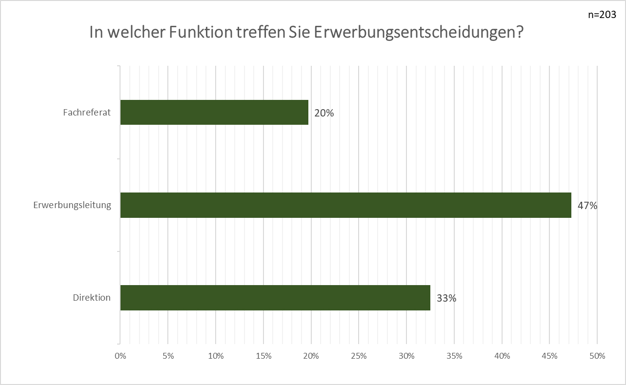 Die Auswahlgesamtheit des vorliegenden Berichts beruht auf den in die Erwerbungsentscheidungen involvierten Beschäftigten – Erwerbungsleitungen, Direktionen und Fachreferate – in wissenschaftlichen Bibliotheken und Forschungseinrichtungen in Deutschland. Der Aufruf zur Umfrageteilnahme wurde an einen Adressatenpool von 487 dienstlichen Funktionsadressen verschickt, woraufhin n=246 Personen den Websurvey ganz oder teilweise beantworteten.19