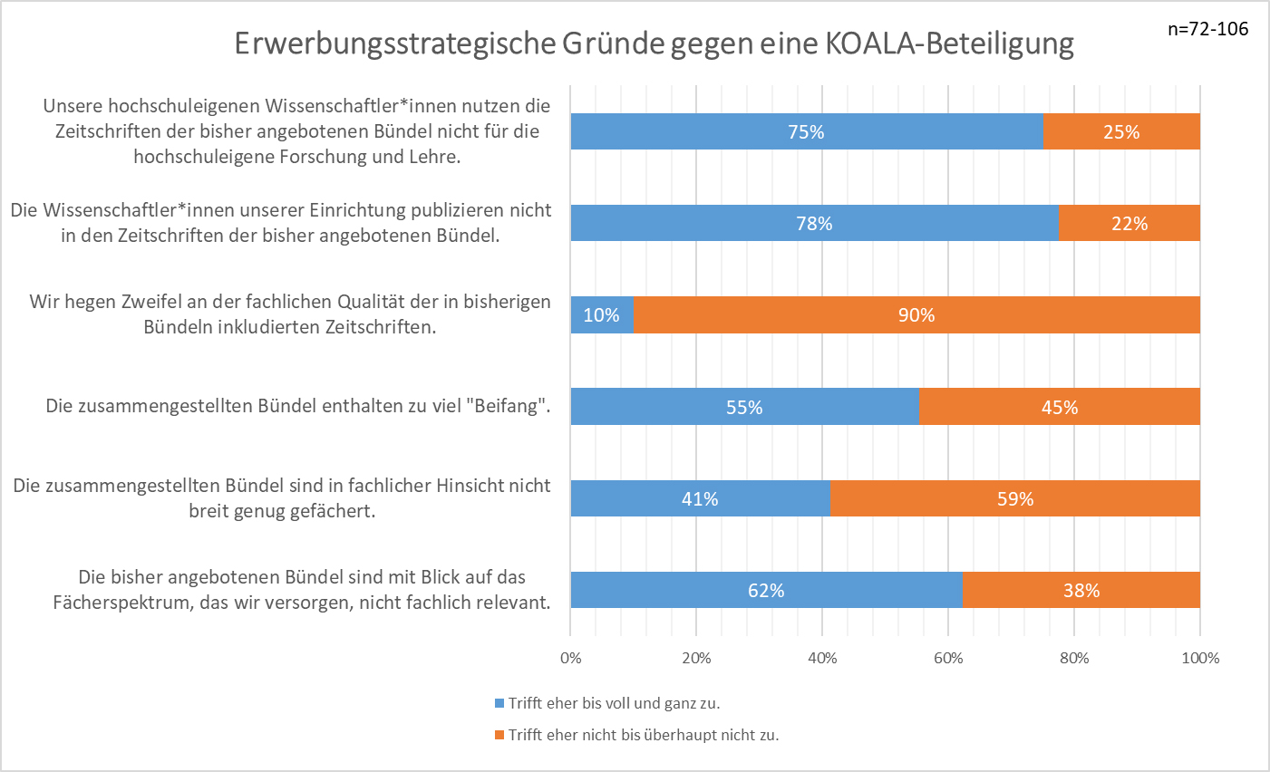 Positiv gewendet: Entscheidend sind die fachliche Passung der finanzierten Zeitschriften zum Spektrum des eigenen Versorgungsauftrags, die nachweisliche Einbindung eigener Forschender als Autor*innen und Herausgeber*innen, sowie das grundsätzlich zur Verfügung stehende Etatvolumen.34 Substanzielle Zweifel am KOALA-Konsortialmodell hingegen, etwa an der haushaltsrechtlichen Zulässigkeit einer Teilnahme, an der fachlichen Qualität der in den bisherigen KOALA-Bündeln angebotenen Zeitschriften, oder aber an der Nachhaltigkeit dieser zunehmend etablierten Diamond-Open-Access-Finanzierungsmodelle, spielen demgegenüber eine nachgeordnete Rolle (n=96).